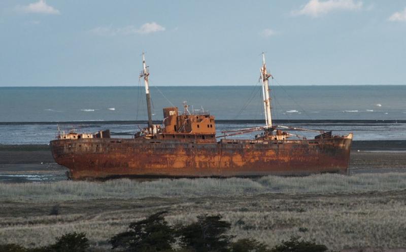 Al aproximarnos, el helicoptero sobrevuela la playa con los restos oxidados del Desdémona, un buque naufragado en el año 1985 que alimenta las leyendas de lo que ocurrió en el Sur.